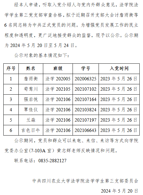 yl8cc永利官网法学学生第三支部委员会拟讨论转正公示