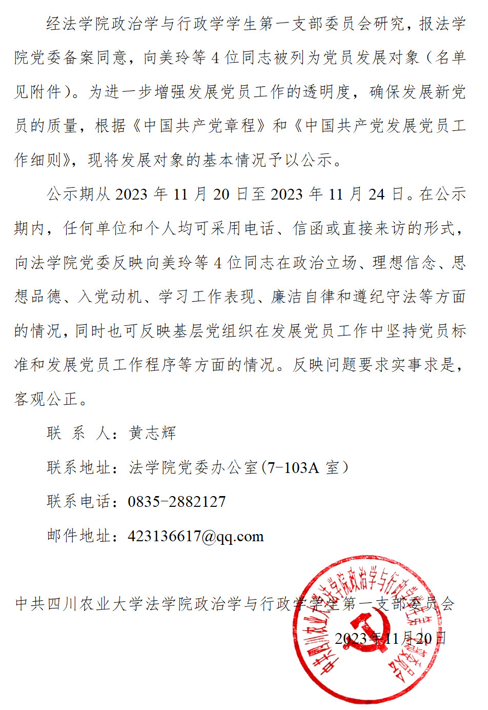 关于拟讨论接收向美玲等4名同志为中共预备党员的公示