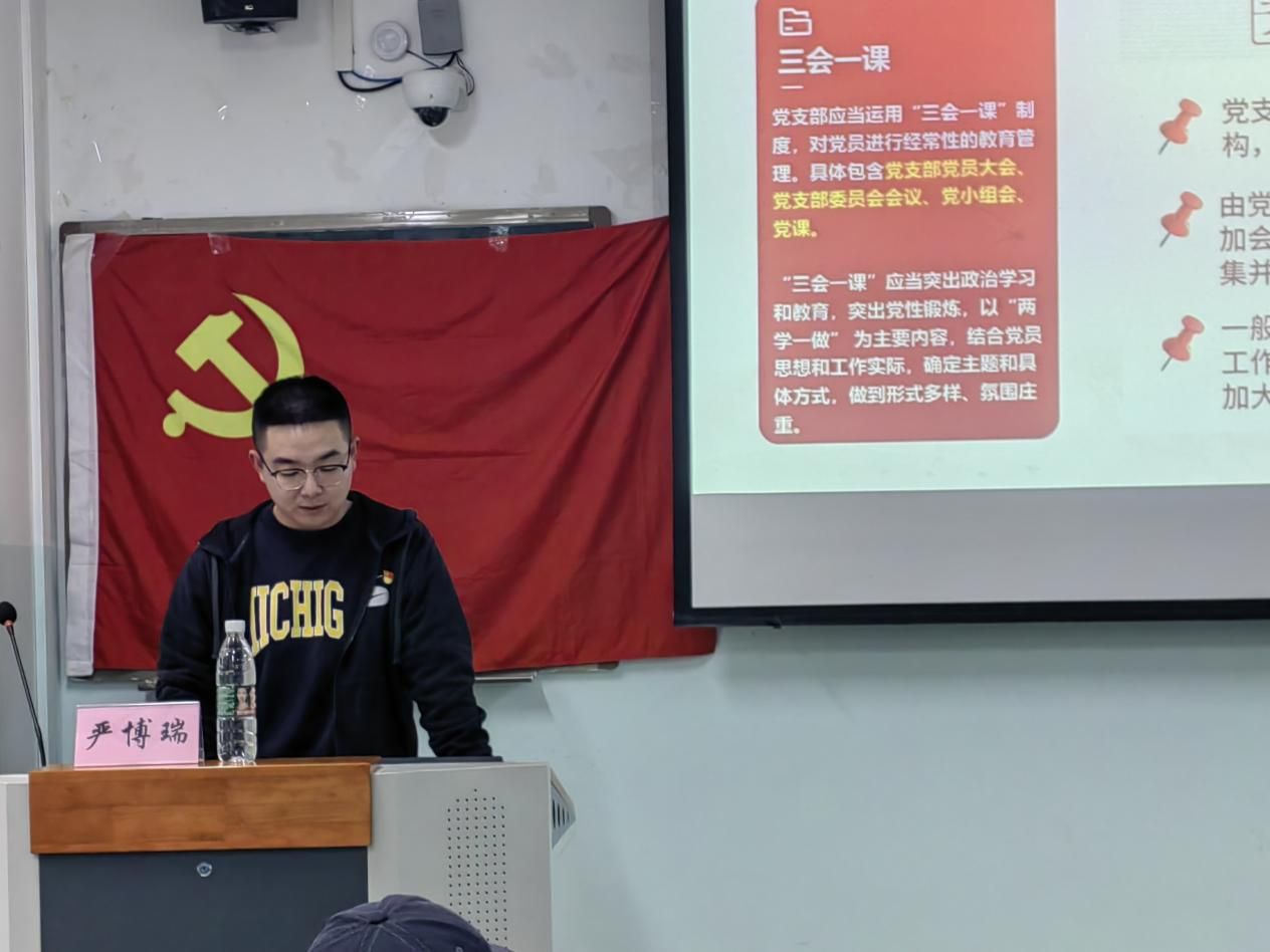 会议伊始,严博瑞向与会成员详细讲述了支部党员组织生活的要求。党支部应当运用“三会一课”,对党员进行经常性的教育管理,具体包含党支部党员大会、党支部委员会议、党小组会以及党课几个部分。同时,党支部还应按规定开展主题党日、组织生活会、民主评议党员和谈心谈话。其中,他强调支部党员大会议题需充分讨论后才可提交,表决应当在有表决权半数以上党员到场后开始。赞成人数超过应到会有表决权人数的半数为通过。