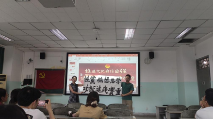 最后,校青马班学员陈玉琴同志为全体同志做了“文化自信”的专题分享,引导同志们在实践中增强文化自觉,坚定文化自信,发挥党员在弘扬中华传统文化中的先锋作用。此外,本次党日活动还邀请到书画协会李振华同学为此次活动作了“学思想、强党性、重实践、建新功”的题字展示。