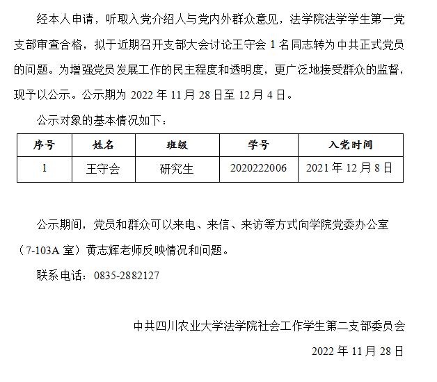 关于拟讨论王守会1名同志转为中共正式党员的公示