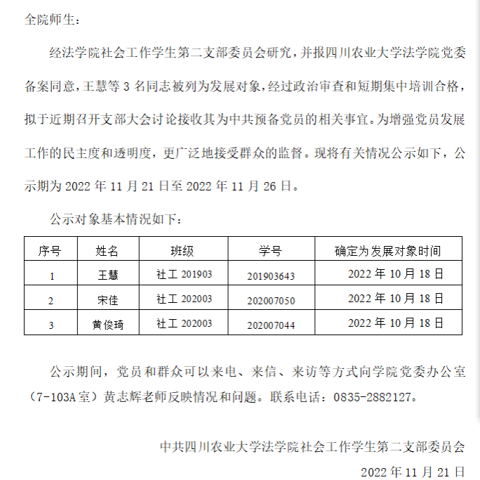 关于拟讨论接收王慧等3名同志为中共预备党员的公示