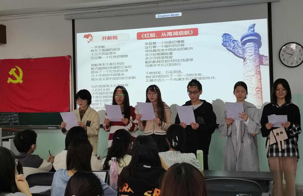 其中,第一小组以“党史学习教育”为主题,紧跟时政热点,围绕学党史、悟思想、办实事、开新局四个方面与大家分享小组的实践成果。小组代表指出,作为新时代的青年,更应做到学史明理、学史增信、学史崇德、学史力行,用党的奋斗历程和伟大成就鼓舞斗志、明确方向,用党的光荣传统和优良作风坚定信念、凝聚力量,用党的实践创造和历史经验启迪智慧、砥砺品格。汇报结束后,该小组现场朗诵了《红船,从南湖起航》表达了爱党爱国的情怀,传递了对中华民族追求民族复兴、国家富强的殷切希望和坚强决心。