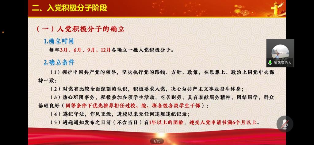 为引导广大入党积极分子进一步学习党的入党的基本程序、了解入党的相关制度、知晓如何成为一名合格党员的标准、督促入党积极分子进一步端正入党动机、明悉党的纪律、懂得党员的义务和权利以及坚定理想信念,10月22日下午,学院于线上开展了“入党的基本程序”专题党课,此次党课由学院党委办公室主任黄志辉老师讲解。