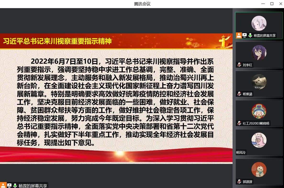 为深入学习贯彻习近平总书记来川视察重要指示精神和四川省第十二次代表大会精神,9月27日下午,学院各学生党支部于线上开展了以“学习习近平总书记来川视察重要指示精神”为主题的组织生活会。