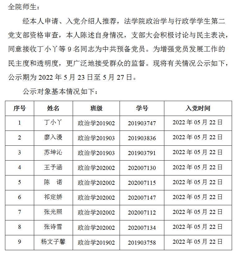 关于接收丁小丫等9名同志为中共预备党员的公示