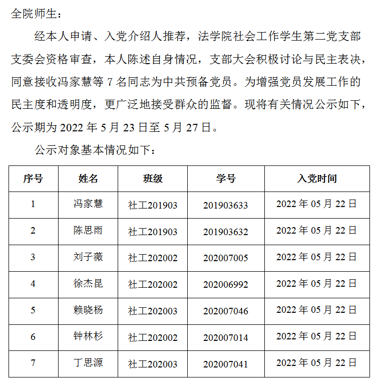 关于接收冯家慧等7名同志为中共预备党员的公示