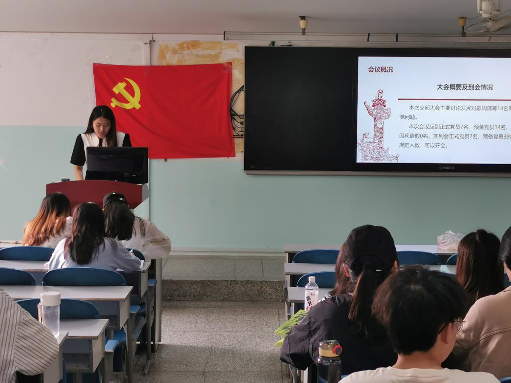 大会伊始,全体起立、奏唱国歌。主持人介绍会议流程并强调会议纪律,全体党员一致通过了监票员和计票员名单,预备党员接收大会有序开展。随后,14名党员发展对象逐一汇报了对党的认识、入党动机、自身表现、主要优缺点及需向党组织说明的有关问题等情况。发展对象陈述完毕后,李岑、张境埕同志对发展对象的表现进行总结并发表意见。随后,季姚同志代表支委会向支部大会报告了对发展对象的审查情况。经支部党员充分讨论后,依次进行无记名投票表决,全体党员一致同意接收周倩等14名同志为中共预备党员。