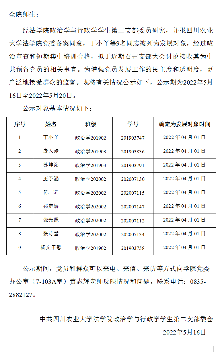 关于拟讨论接收丁小丫等9名同志为中共预备党员的公示