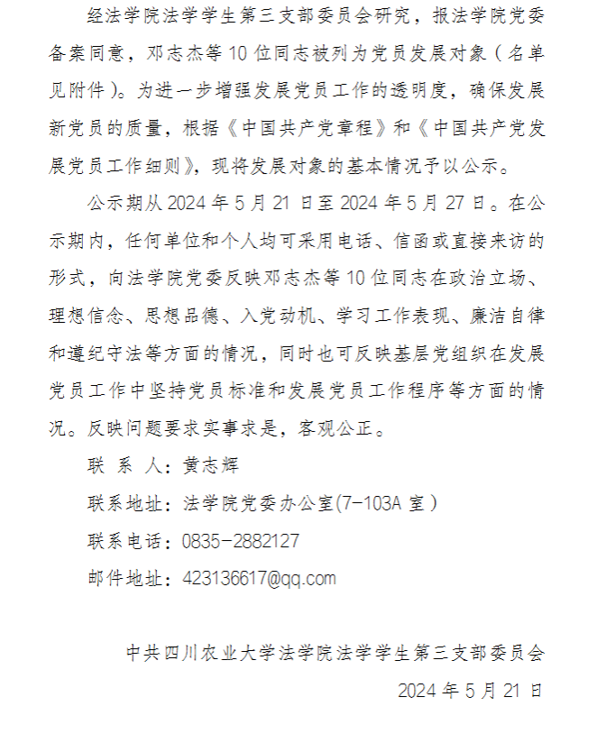 关于拟讨论接收邓志杰等10位同志为中共预备党员的公示