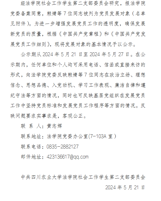 关于拟讨论接收赖婧等7位同志为中共预备党员的公示