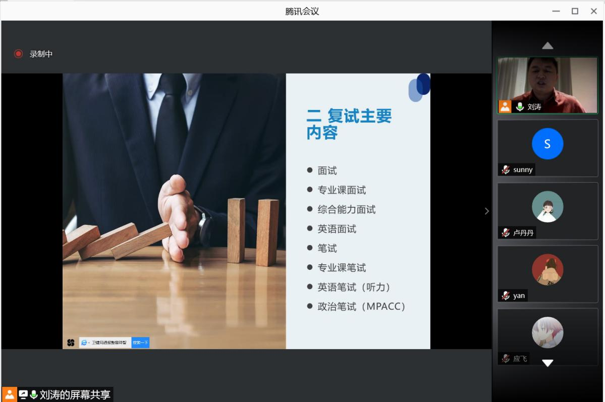 学院学生会就业服务部邀请文都考研复试实战导师刘涛在线主讲考研复试准备工作及流程。刘老师以开门见山的讲述风格、清晰的逻辑条理,详细地为考研学子介绍了复试准备工作和复试流程;针对线上和线下面试分别提出应当注意的细节问题;总结了“导师最喜欢问的十大综合面试问题”等干货,丰富的技巧性指导获得同学们的好评。