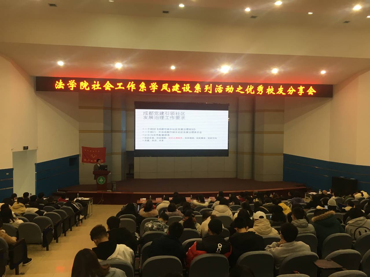 11月26日下午,由学院社会工作系主办,学生社会工作协会承办的社会工作系学风建设系列活动之优秀校友分享会在学校逸夫楼小礼堂顺利开展。学院党委副书记朱雨欣,社工系全体教师出席本次分享会,社工系05级毕业生周正彬和09级周凌旭两位优秀校友担任分享人,社会工作专业17、18、19级学生悉数参与此次分享会。此次活动是专业教育的一部分,通过两位校友对于工作与社工的认识、职业感受以及就业方面的经验分享,帮助同学们明确目标,规划未来,激发社会工作系学子的学习意识和探索精神。