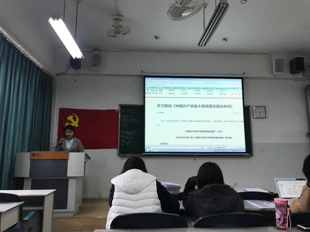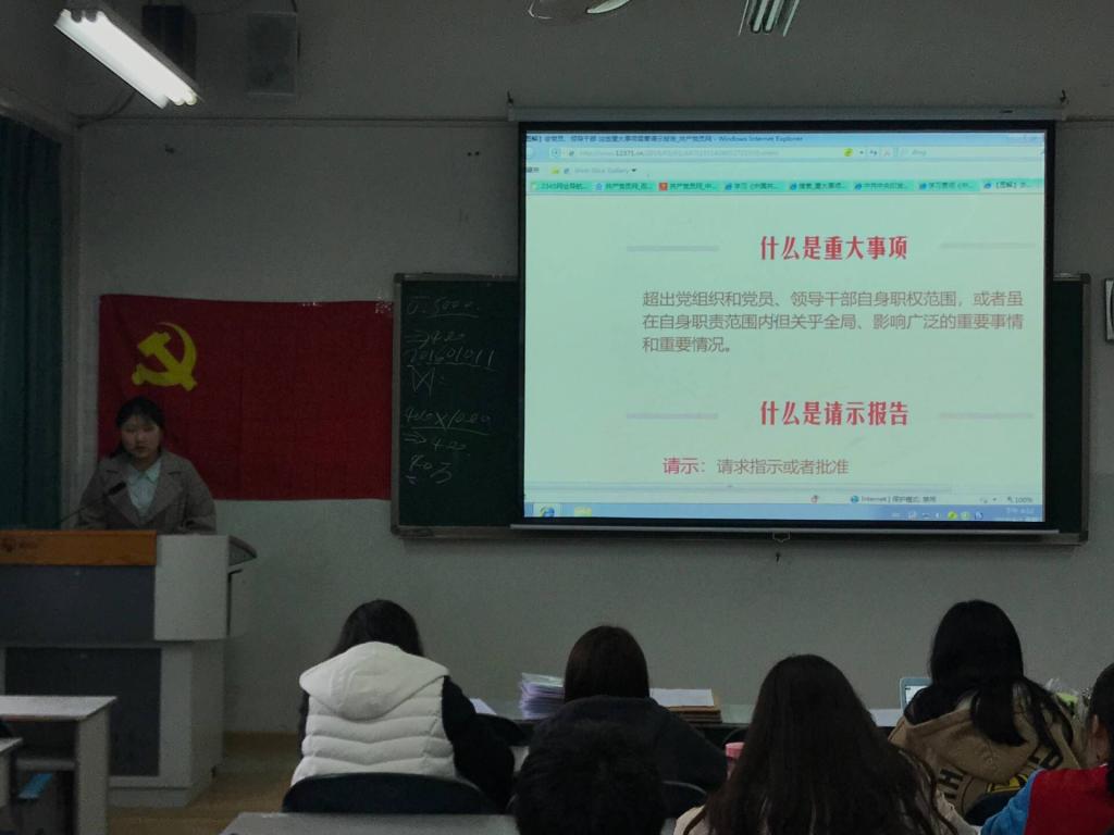 政治学与社工党支部在冯铃同志的带领下,全体党员了解与学习了党章党规具体内容,其中关于《中国共产党重大事项请示报告条例》让全体学生党员明确了什么是重大事项、什么是请示报告以及向谁请示报告等详细内容。法学支部则由黄怡同志主持,利用理论与案例相结合的分享方式,对《中国共产党章程》、《中国共产党支部工作条例(试行)》、《中国共产党纪律处分条例》进行探讨学习,促使每一位学生党员时刻牢记自己的党员身份。同时还带领大家以视频学习的形式进一步领会各项文件的精神实质。