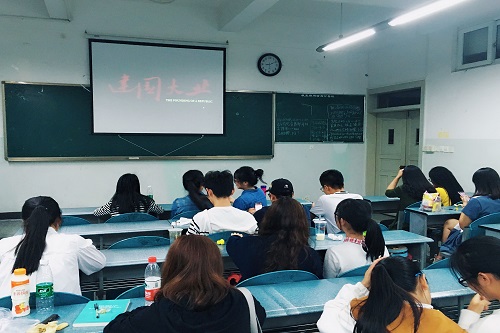 活动围绕爱国教育片《建国大业》展开,以生动形象的视频教学展现建国以来的艰辛历程与不屈的风采。在观看过程中,学子的心也随着剧情的开展起伏。从中国共产党几经沧桑与磨难,在血与汗水中坚挺过来到时代青年们立志报国,不惧特务的暗杀,毅然站在宣传民主和平的第一线,再到在淮海战役胜利结束后,毛泽东、朱德等国家领导人相拥庆祝的动人场景,一幕幕刻画出新中国成立的艰难险阻,激起爱国豪情万丈。“看完了《建国大业》这部电影,觉得现在的生活来之不易,是老一辈的革命家用鲜血换来的。我们更应该珍惜现在美好的一切,加倍努力,精诚奉献。”一位同学感叹道。