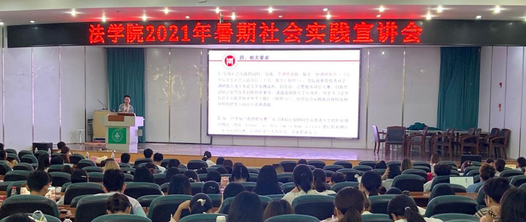 6月21日上午,2021年暑期社会实践宣讲会在十教二楼小礼堂召开,学院团委副书记李月、校法律援助中心指导教师李军妍、校法律援助中心副主任黎晨枭同学、校优秀社会实践项目“炬火公益”团队队长吉苏莫夫出席活动,共计200余名师生到场参与。