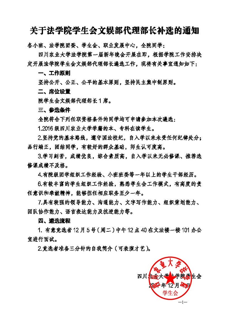 关于yl8cc永利官网学生会文娱部代理部长补选的通知