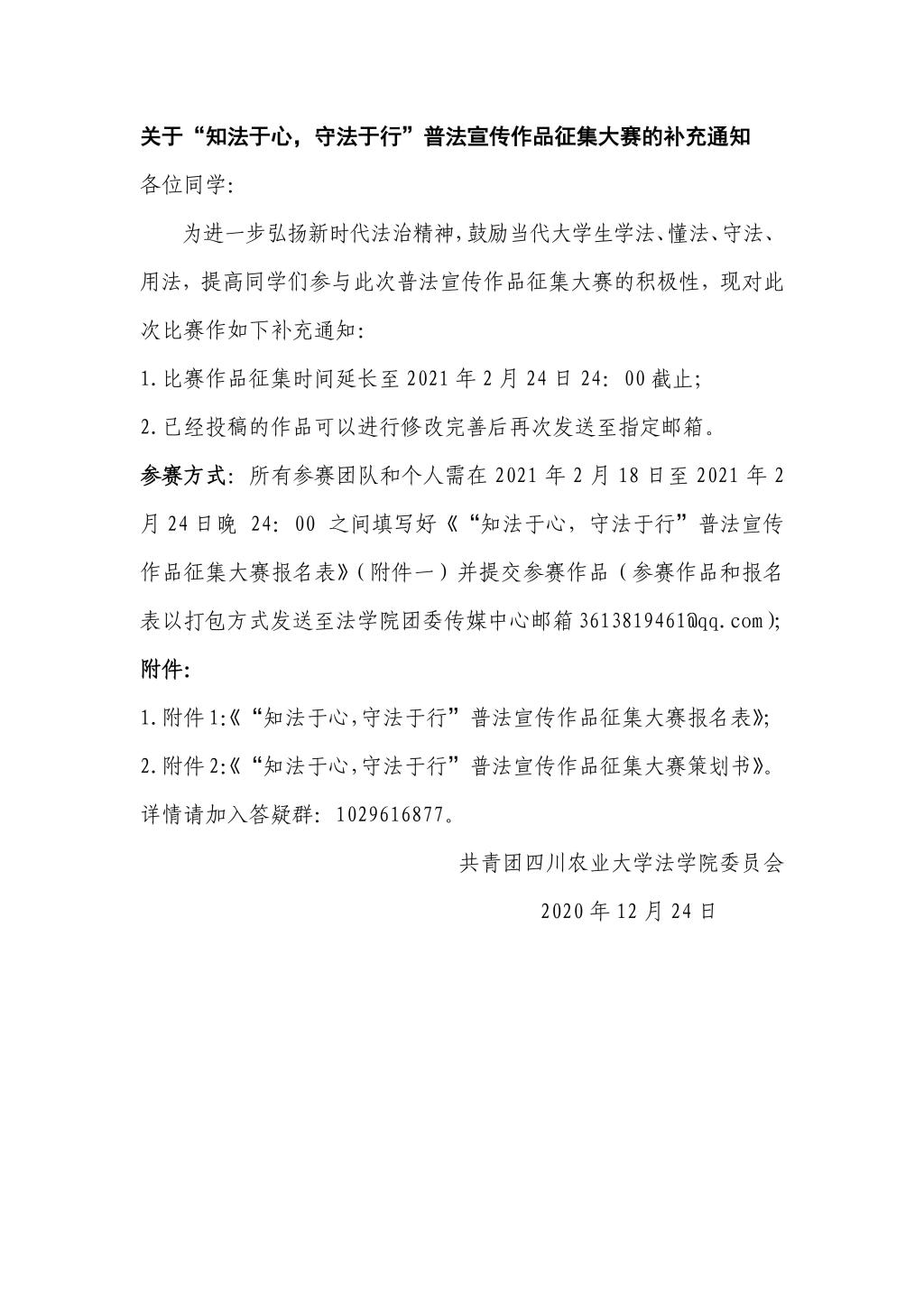 关于“知法于心,守法于行”普法宣传作品征集大赛的补充通知