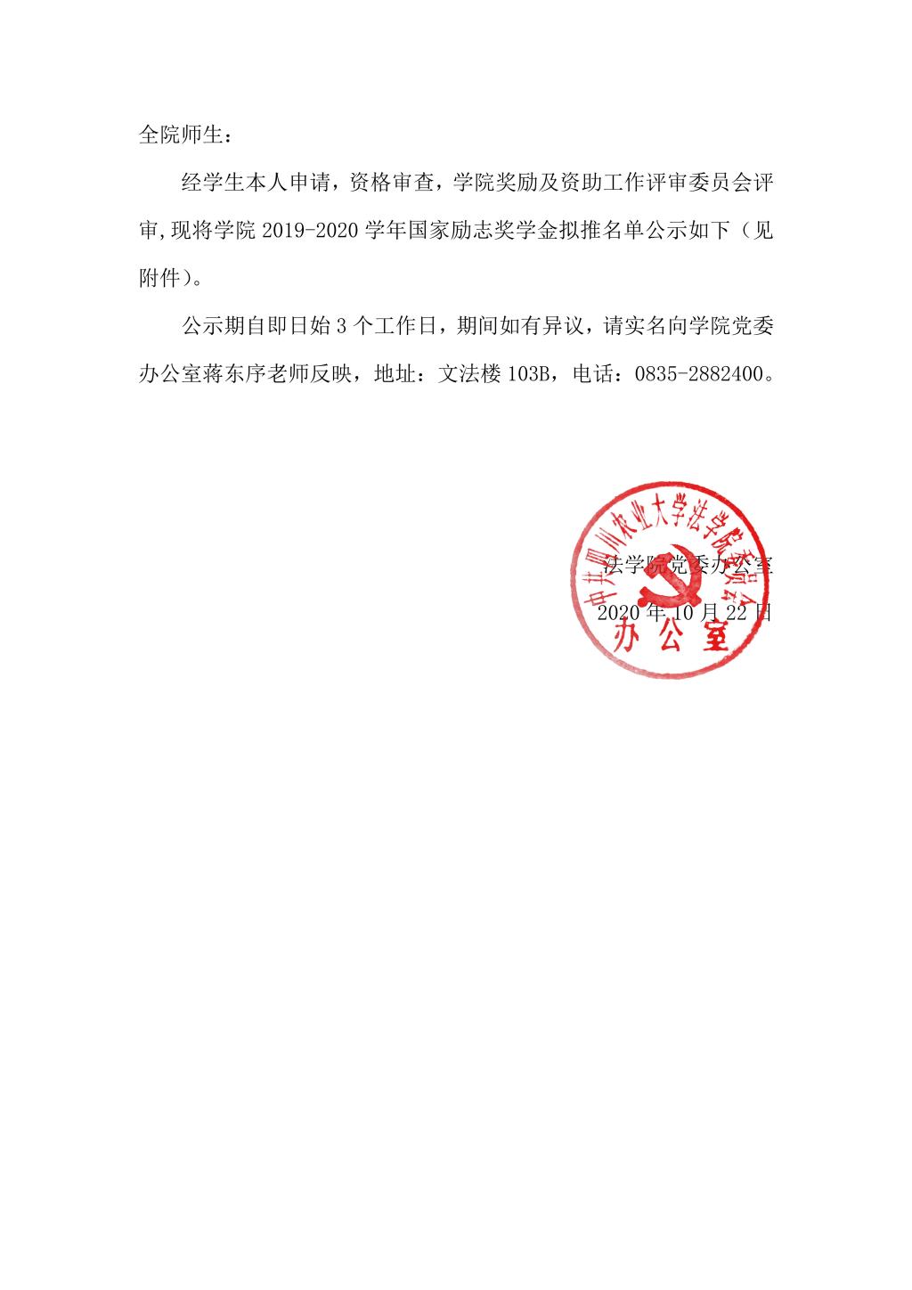 yl8cc永利官网2019-2020学年度国家励志奖学金拟推名单公示