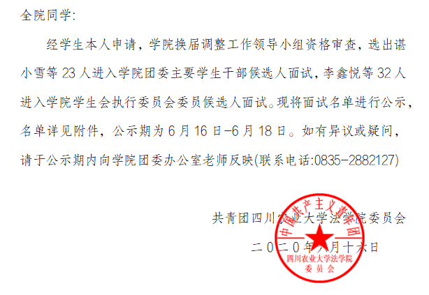 学院关于第五届团学组织主要学生干部候选人面试名单的公示