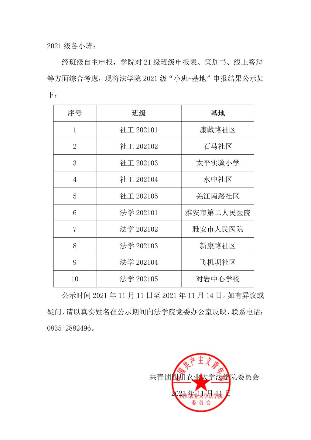 关于yl8cc永利官网2021级“小班+基地”申报结果的公示
