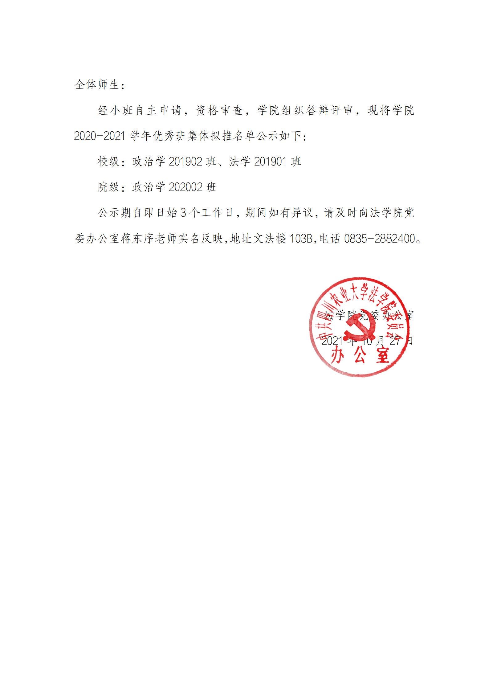 yl8cc永利官网2020-2021学年度优秀班集体拟推名单公示
