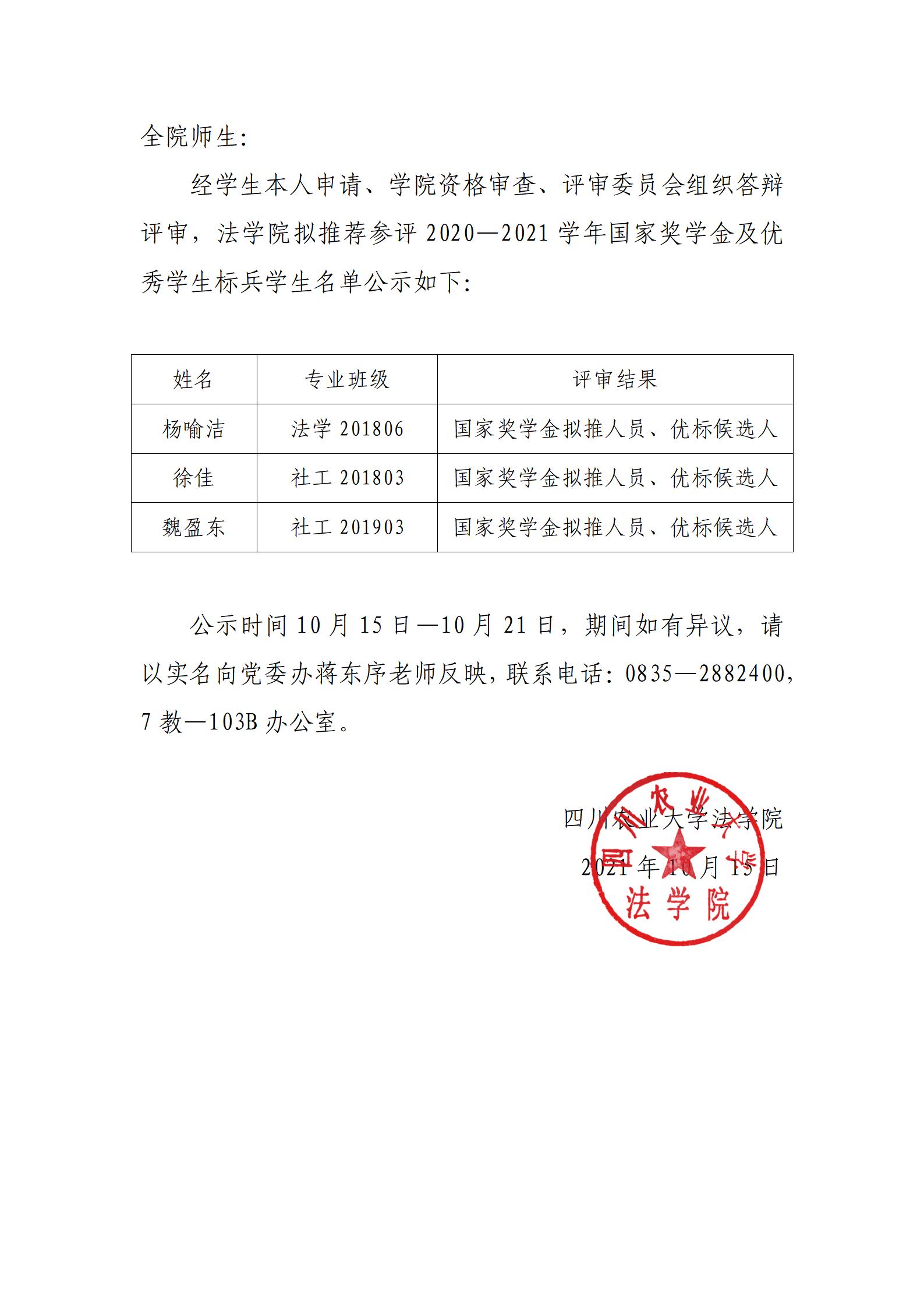 yl8cc永利官网2020—2021学年国家奖学金拟推人员及优秀学生标兵候选人名单公示
