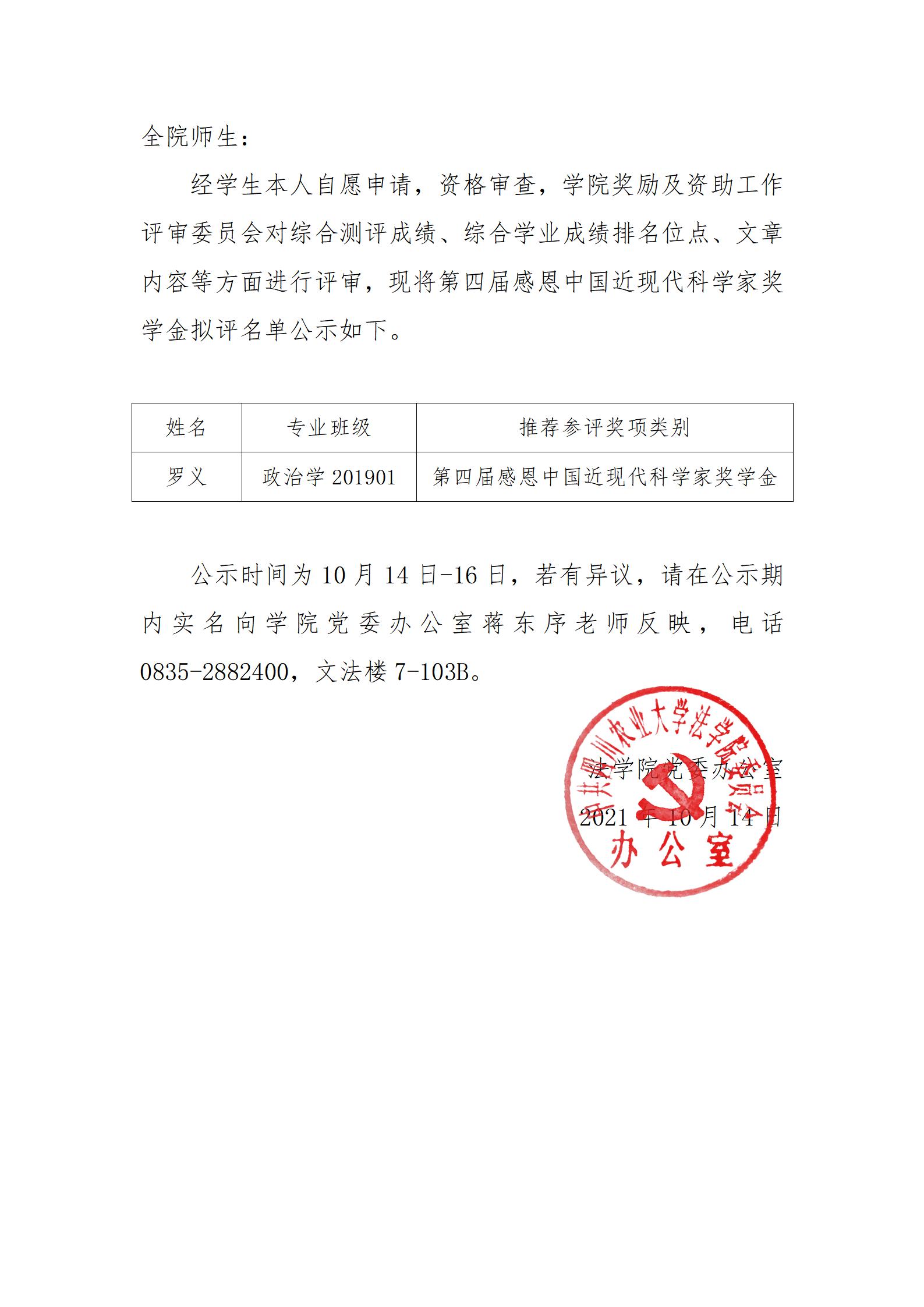 第四届感恩中国近现代科学家奖学金拟推人员公示