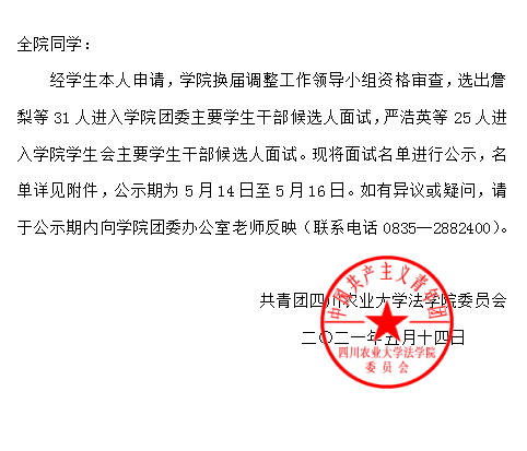 学院关于第六届团学组织主要学生干部候选人面试名单的公示