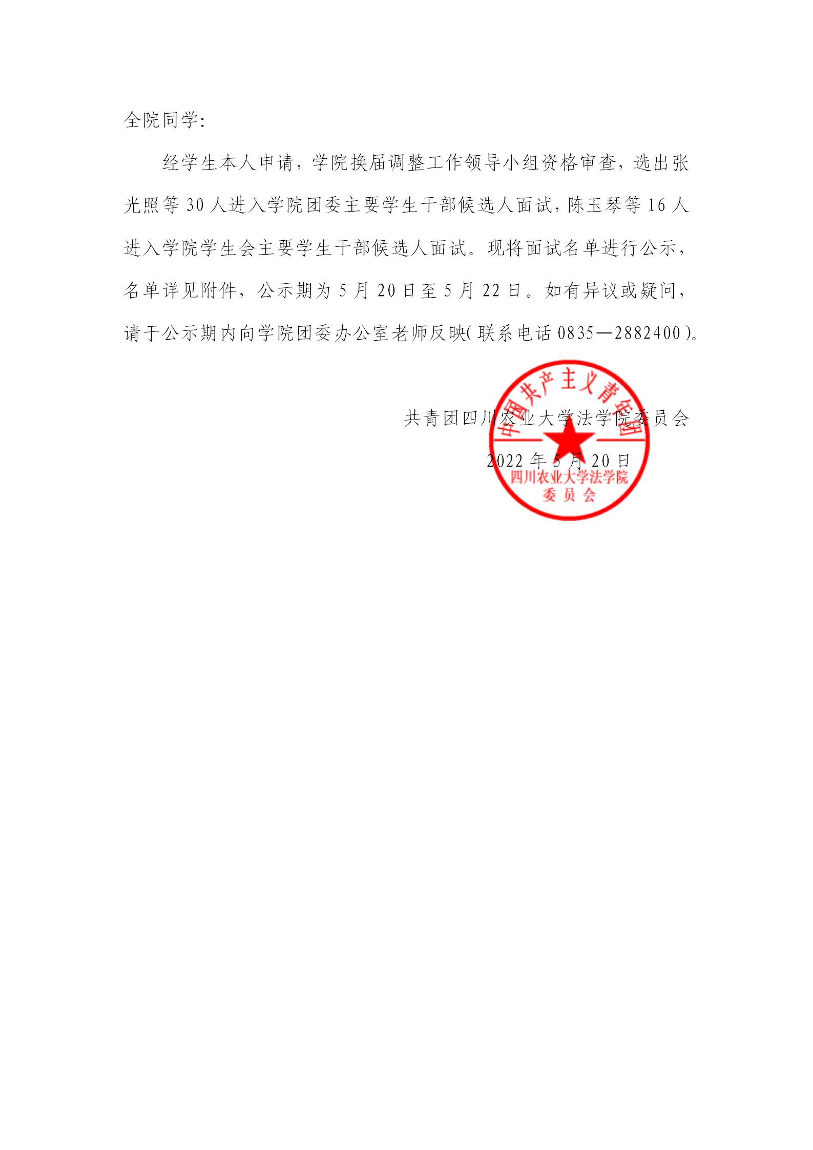 学院关于第七届团学组织主要学生干部候选人面试名单的公示
