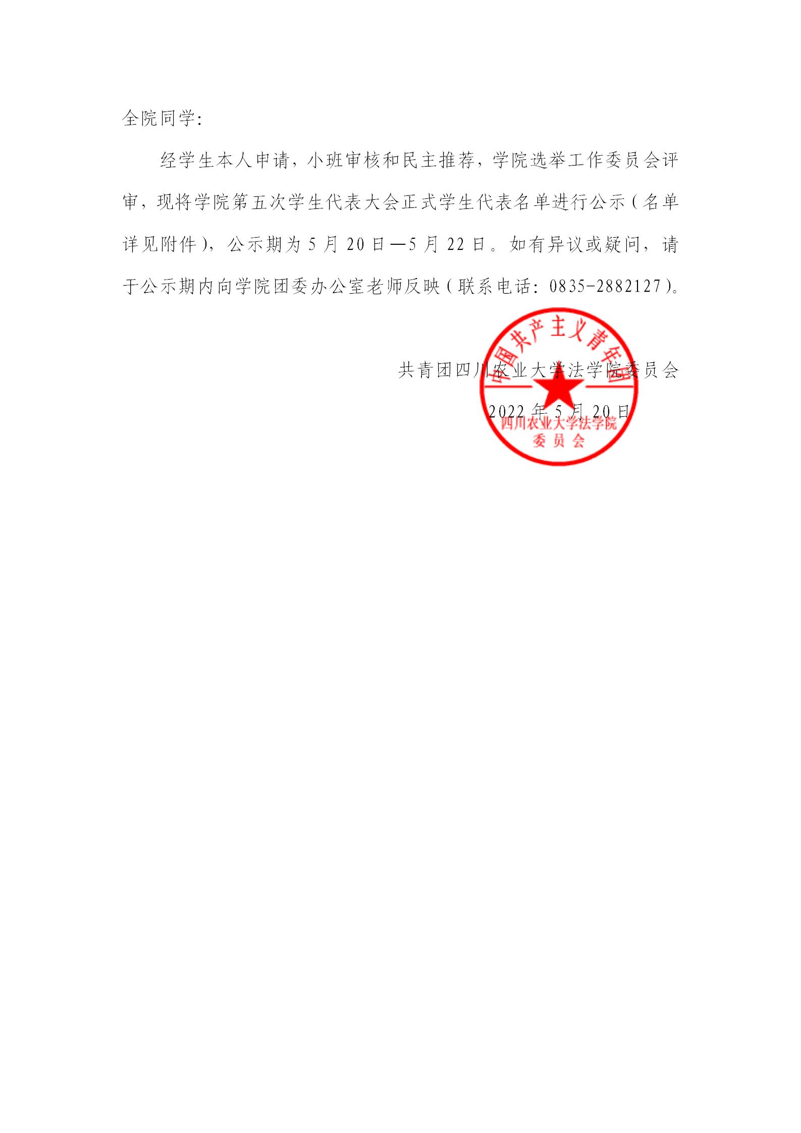 学院关于第五次学生代表大会正式学生代表名单的公示