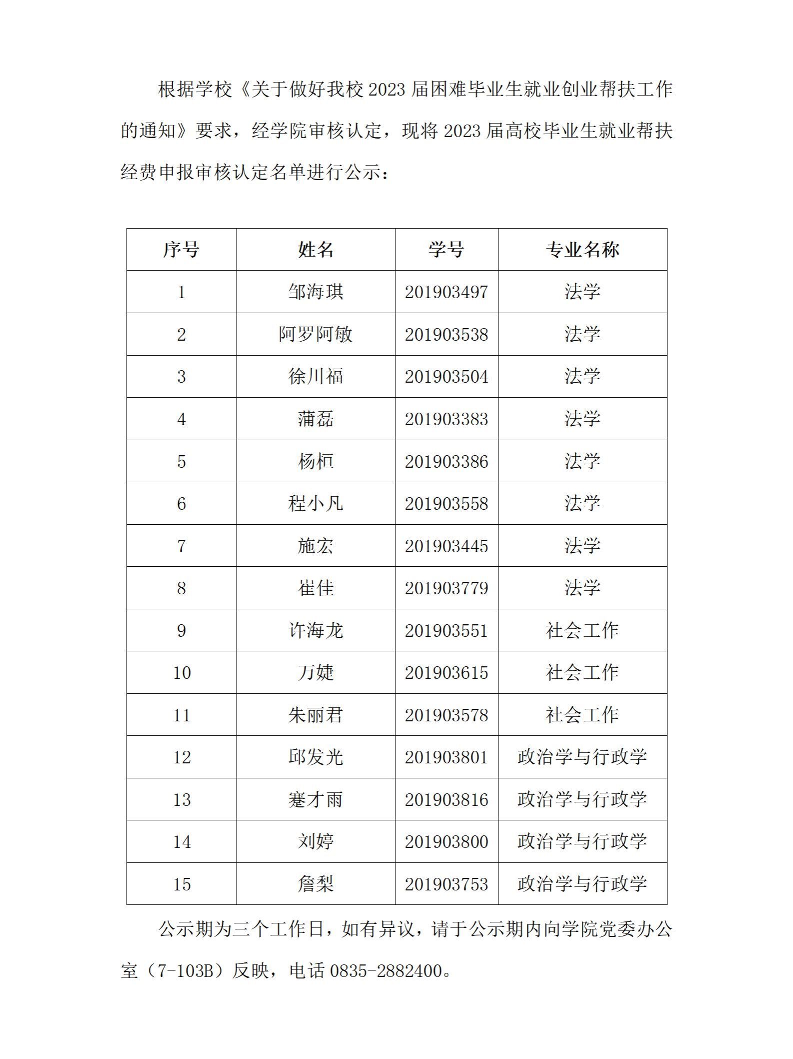 关于2023届毕业生就业困难帮扶经费申报审核认定名单公示