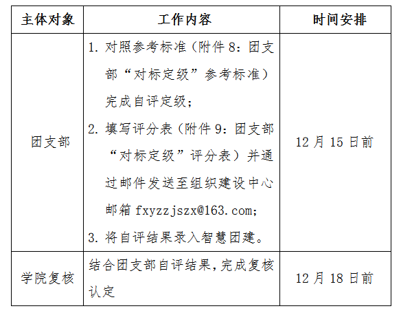 详见附件8:团支部“对标定级”参考标准及学院复核标准。