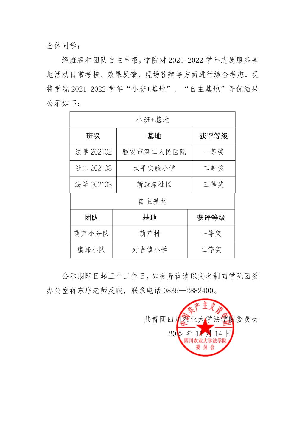 关于学院2021-2022学年志愿服务基地活动评优结果的公示