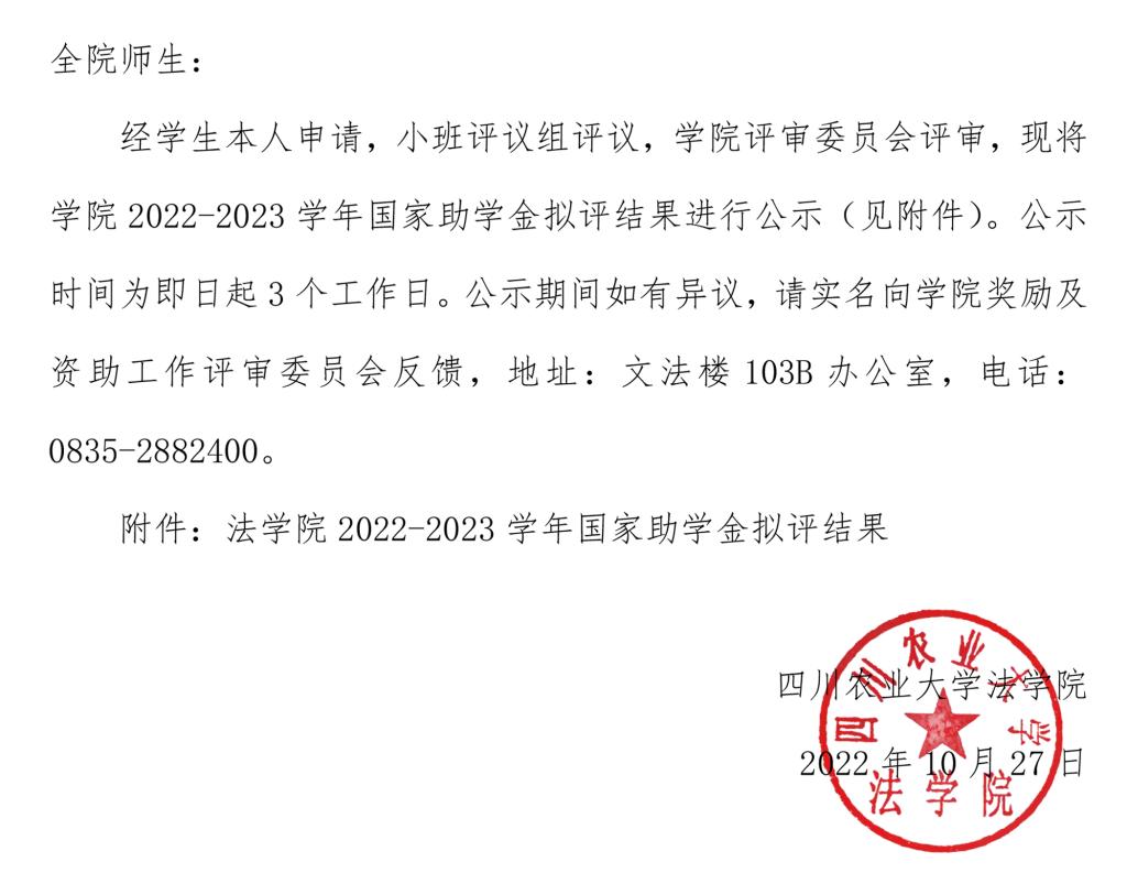 yl8cc永利官网2022-2023学年国家助学金拟评结果公示
