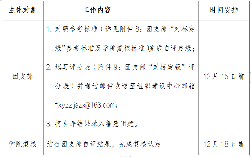 (三)工作标准(详见附件8:团支部“对标定级”参考标准及学院复核标准)