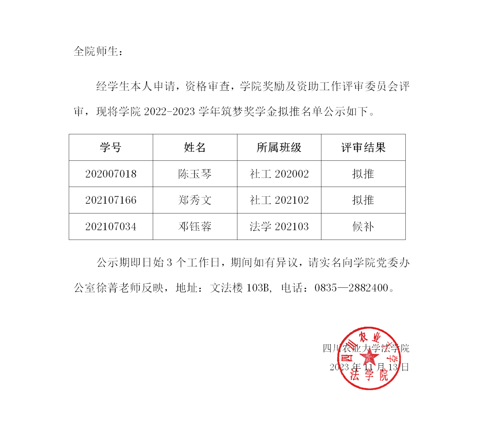 yl8cc永利官网2022-2023学年度筑梦奖学金拟评名单公示