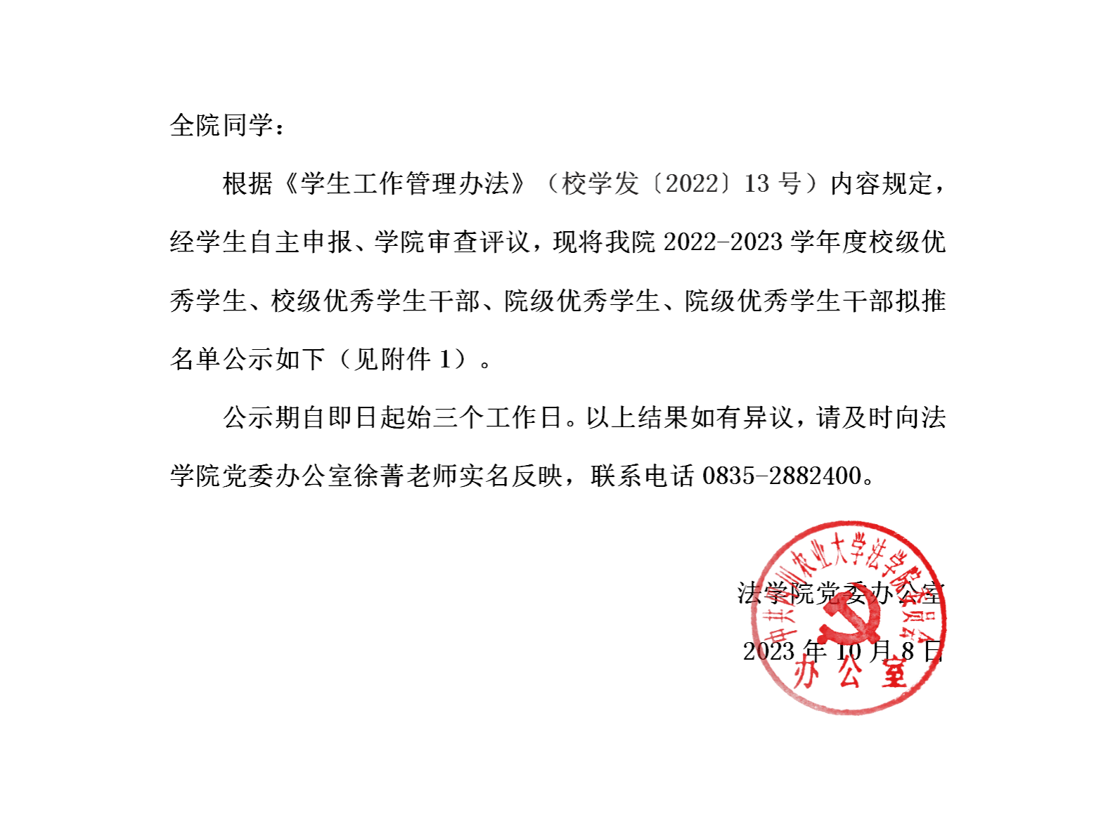 yl8cc永利官网2022-2023学年度“优秀学生”、“优秀学生干部”拟推名单公示