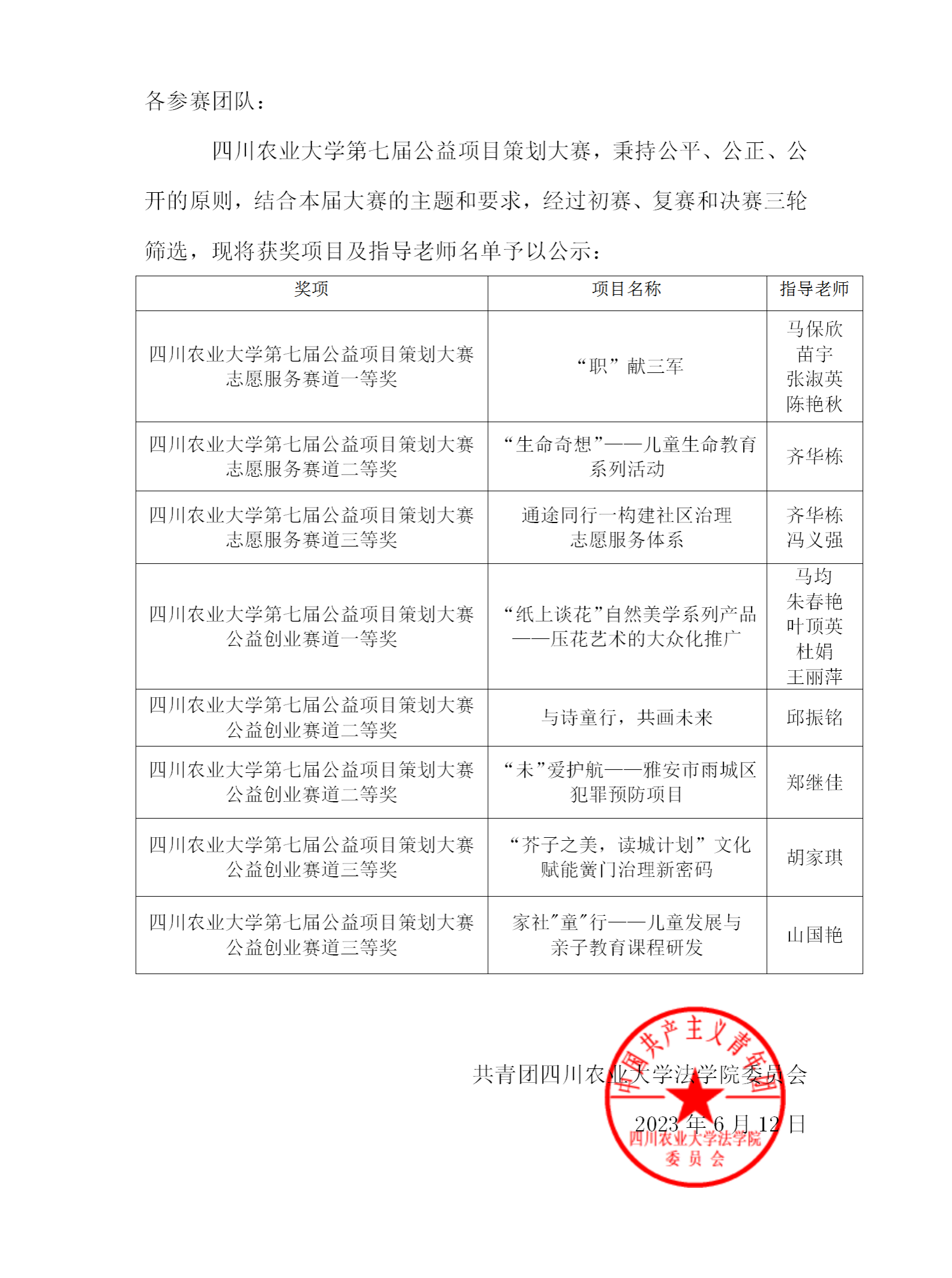 关于四川农业大学第七届公益项目策划大赛获奖情况的公示
