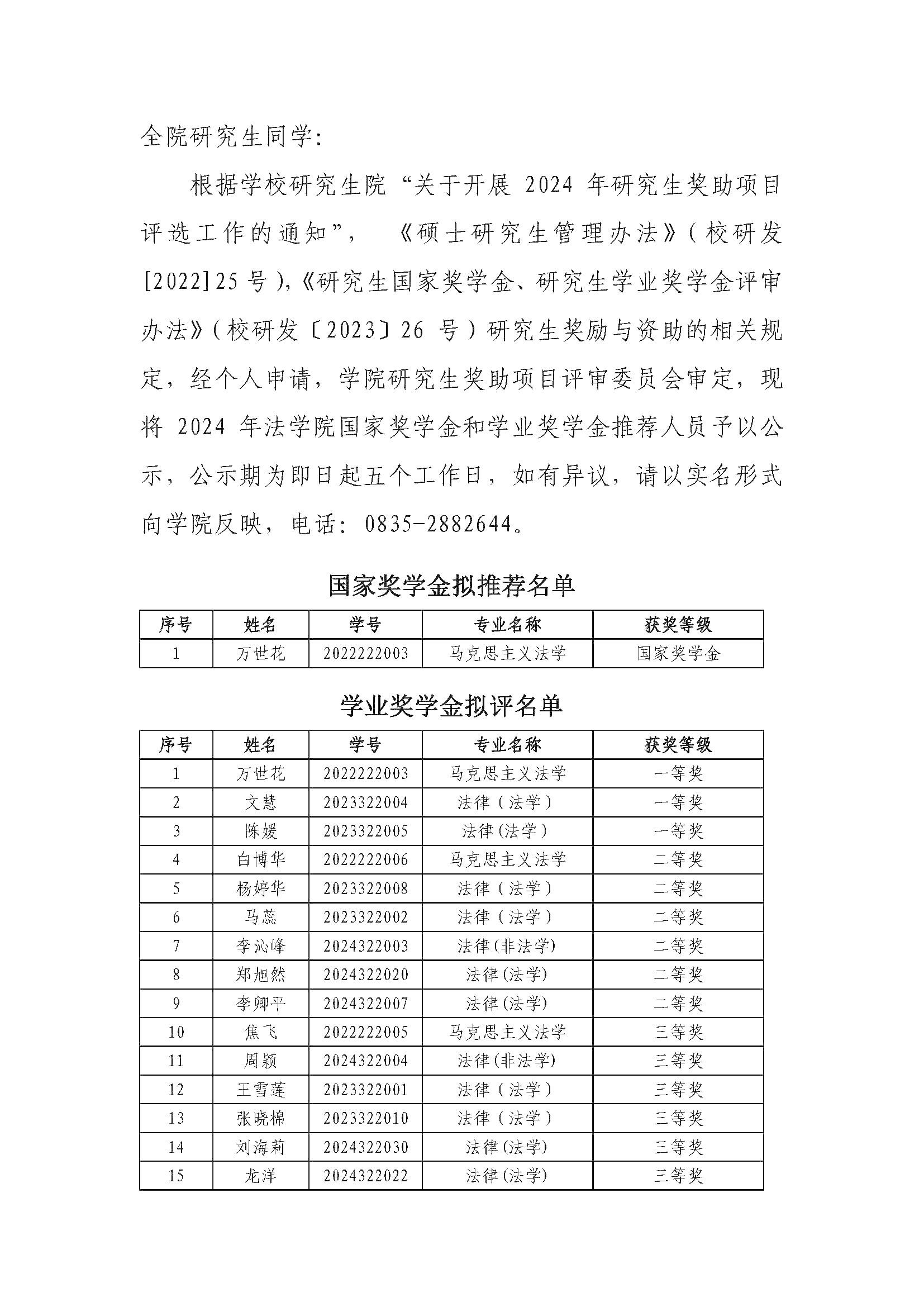 yl8cc永利官网2024年研究生国家奖学金、学业奖学金拟评名单公示