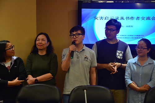 5月12日晚,“灾害启示录丛书作者交流会”在雅安市雨都饭店若水厅举办。中国社会工作教育协会副会长、中山大学教授张和清,香港理工大学应用社会科学系副教授、中国研究及发展网络中心执行主任古学斌,台北大学公共行政与政策学系兼任副教授、台湾海棠文教基金会顾问陆宛苹,四川尚明公益发展研究中心理事长、四川省社会科学院研究员郭虹,香港理工大学客席导师霍小玲,南都公益基金会黄庆委,鲁甸泉心青少年社会服务中心阮俊东,成都心家园社会工作服务中心但小莉,四川广元利州区希望社工服务中心谢缘,北川大鱼青少年公益发展中心高思发,成都市高新区美锦社区公益发展中心理事长殷刘倩,yl8cc永利官网社会工作系主任齐华栋及来自全国不同地方的社会组织机构代表、老师、学生出席新书发布会,高思发主持会议。