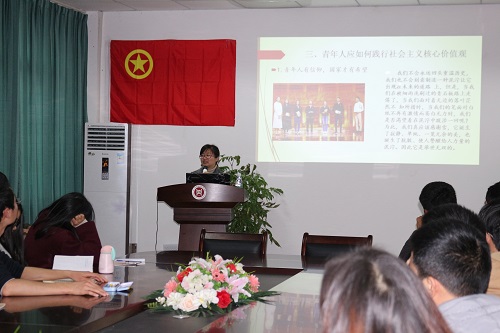 讲座中,刘建平以时事热点“萨德”事件开篇,以“践行社会主义核心价值观”为主题,以“青年人的责任”为线索,引出“责任感”这一关键词。刘建平强调各小班团干应对青年人的责任时刻谨记。接着刘建平分别从社会主义核心价值观的 “发展历程”、“主要内容”和“青年人如何践行”三个版块详尽地讲解了“社会主义核心价值观”的诞生背景、推广实施和具体要求等问题,使各小班团干对“社会主义核心价值观”以及“青年人的责任”有了更加深入的理解。