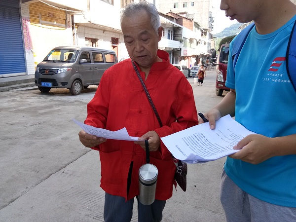 7月16日,学院“融法利民”队来到巴中通江县杨柏乡,就《民法总则》中“老人监护制度”相关内容开展问卷调查并进行普法宣传。