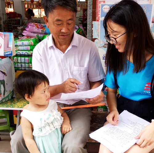 当地老人普遍退休较早,老年生活通常与孙辈度过,但面对问卷,他们又荡起了发表看法的激情。访谈中总是能遇见很多小朋友,在老人认真阅读填写问卷的时候,队员们时常逗小朋友玩儿,填好问卷后小朋友总会甜甜地微笑招手,有流动的温情在里面。