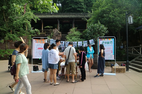 “叔叔阿姨您们好!我们是川农的学生,暑假来这做传统手工文化夏令营,这是请镇上会编织手艺的老人们教孩子们编织的作品,希望您能献一点爱心,我们会把卖竹编的钱用于竹编手艺的传承。”夏令营的最后一天,同学们带着孩子们来到镇上义卖这些完成的手工艺品。
