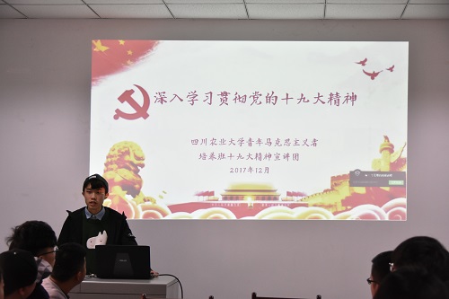12月25日,四川农业大学青年马克思主义者培养班十九大精神宣讲团前往yl8cc永利官网宣讲十九大精神。宣讲团成员罗元源、刘子欣结合自身学习情况,分别前往yl8cc永利官网团委、学生会以及政治学201601支部和政治学201602支部围绕“争做新时代堪当大任的新青年”主题进行分享与交流。