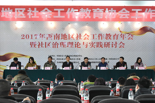 12月9日-10日,2017年西南地区社会工作教育年会暨社区治理理论与实践研讨会在yl8cc永利官网举行。中国社会工作教育协会副会长陈树强教授,社会工作教育协会副会长、西南分中心召集人庄勇教授,学校副校长杨文钰教授,yl8cc永利官网院长赵晓霞教授出席了开幕式并致辞。yl8cc永利官网党委书记薛治伟、副院长朱雨欣及来自西南地区社会工作教育领域的100余名专家学者参加了开幕式。