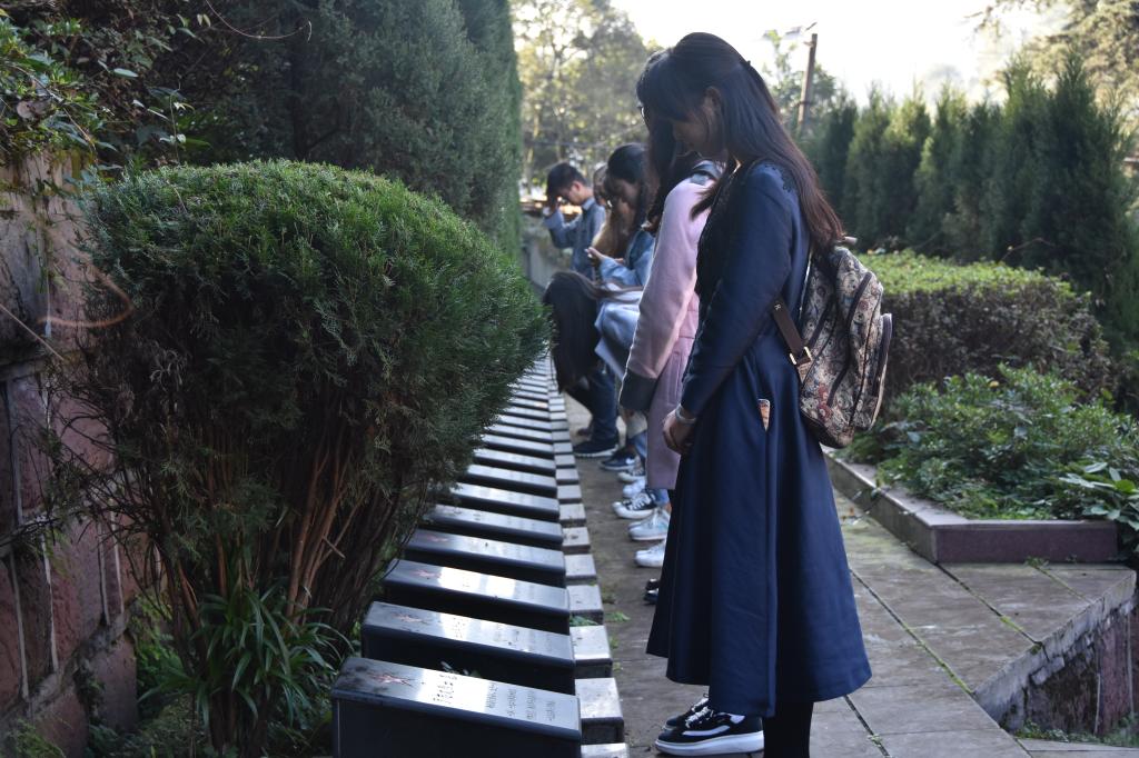 上午9时,入党积极分子们怀着无比崇敬的心情,在人民革命纪念碑前驻足瞻仰。为了让大家了解更多的英雄事迹和烈士的丰功伟绩,不忘先烈不怕牺牲、艰苦奋斗、勇于担当的精神,并将这种精神传承发扬,学院党建服务中心青先部负责人罗荣从纪念碑的修建背景、历史意义等方面为在场的入党积极分子一一进行了讲解。石墓区前,所有人郑重三鞠躬并默哀3分钟,沉默悼念革命烈士。