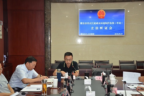 9月7日上午,雅安市人大常委会组织召开立法听证会,就《雅安市青衣江流域水环境保护条例(草案)》,零距离、全方位听取社会各界的意见建议。会议由市人大常委会副主任李毅主持,市中级人民法院行政庭副庭长秦华、四川农业大学法学系教师李飞鸣等受邀参会。