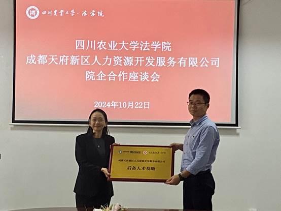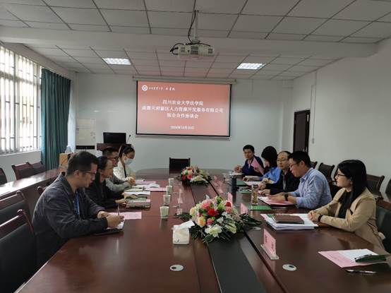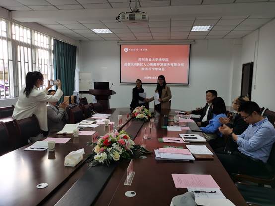 院长颜勇介绍了学院基本情况,他谈到法学和社会工作办学历史悠久,人才培养质量高,相信通过与天府人资公司的合作,能发挥双方优势,培养更多高素质法律人才。院党委副书记、纪委书记,副院长唐薇介绍了学院人才培养情况,重点阐述了学院与实务部门联合培养人才的模式,希望双方能在学生实习、就业、培训、师资交流等方面加强合作。